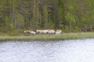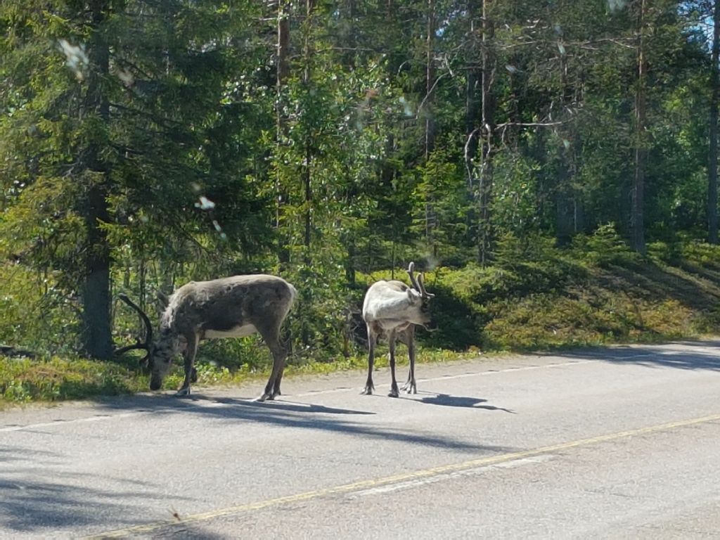 Auf der Fahrt nach Kusamo haben wir die ersten Rentiere in freier Wildbahn entdeckt, die uns fast zum Ausflippen brachten. Die vorbeifahrenden Einheimischen haben sicher gedacht, dass diese Touris spinnen, so einen Aufstand wegen ein paar Rentieren zu machen. Aber für uns war es schliesslich das erste Mal, dass wir welche sahen. Die Rentiere treiben sich über den Sommer frei in einem riesen Gebiet herum und werden im Herbst dann von den Samen zusammengerieben, ihrer Markierung nach aussortiert und an die verschiedenen Besitzer verteilt.