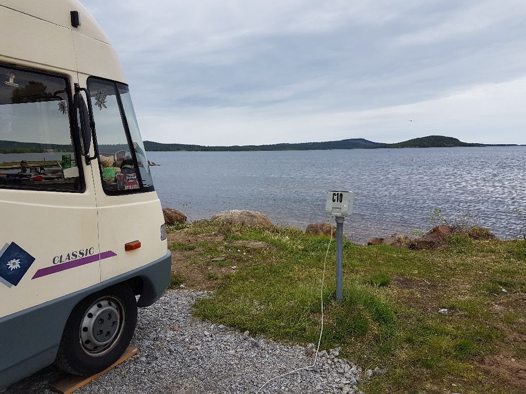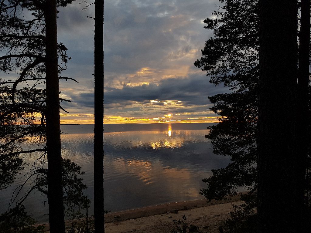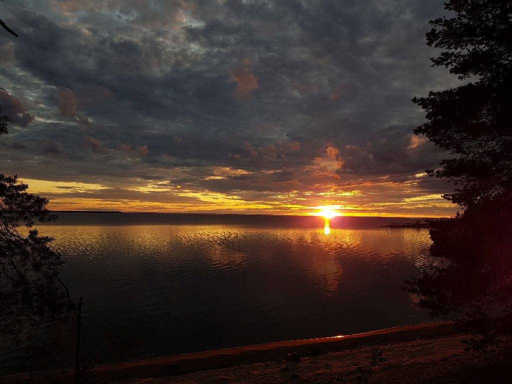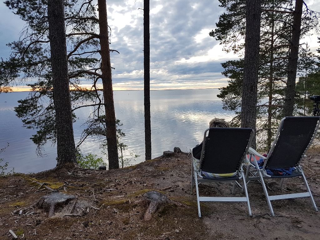 Dort findet am Tag auch das Inselleben statt und viele Einheimische kommen dort hin zum Essen und um Kontakt mit anderen zu haben. Unser Camping liegt im Wald mit direktem Blick auf und über den grossen See. Zum ersten Mal genossen wir an diesem Abend bis weit nach Mitternacht den Sonnenuntergang (dauerte hier gute 1½ Std.) um dann schon nach bereits 3 Stunden später wieder aufzugehen. Für die nächsten Tage bedeutet dies für uns konstanter Schlafmangel! Es ist immer länger hell und die Abende sind traumhaft schön mit den verschiedenen Lichtern.