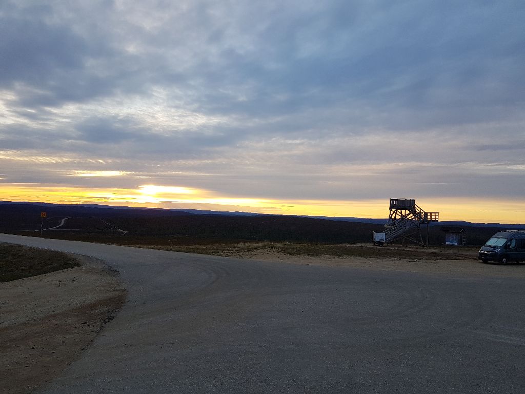 Etwa 70 km vor unserem nördlichsten Ziel fahren wir auf den Hügel Kaunispää, (438mM), ein Wintersportgebiet. Oben angekommen war uns sofort klar, dass dies nun der Ort war an dem wir die Mitternachtssonne zu sehen bekommen werden. Schliesslich standen wir auf einem riesen Parkplatz mit 360°Grad Sicht über das weite Land. Wir verfolgten das Specktakel die ganze Nacht, genossen viele verschiedene Stimmungen und waren am nächsten Tag trotz des Schlafmangels immer noch völlig aufgedreht.
