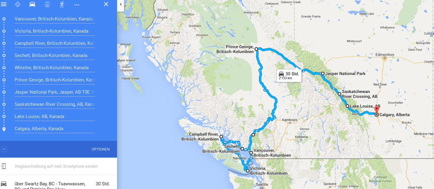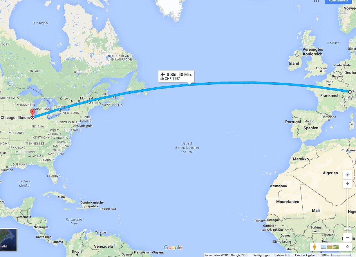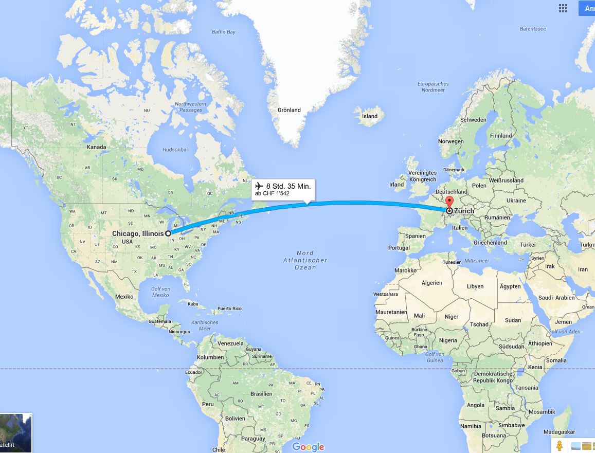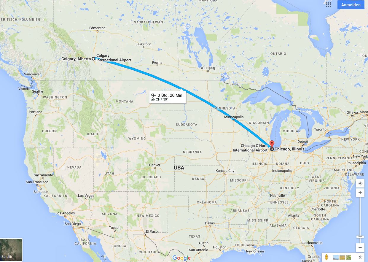 Unsere Flugrouten sehen wie folgt aus: Flug Zürich – Chicago Flug Chicago – Vancouver Rückflug Calcary – Chicago Rückflug Chicago – Zürich Übersicht unserer gesamten Route per Wohnmobil Gesamte Route per Wohnmobil